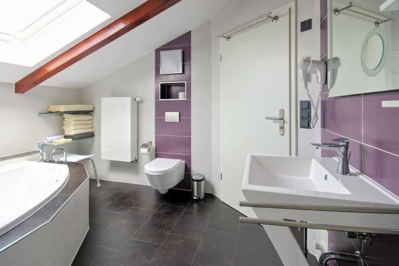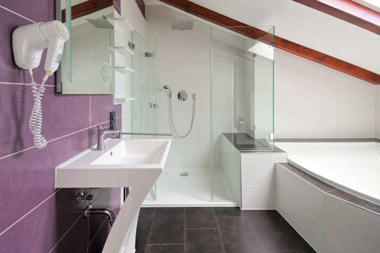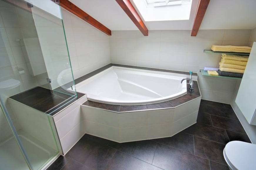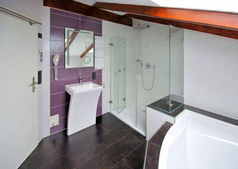 Bad: Dachfenster, Fußbodenheizung, Dusche 120 x 90 cm mit Regendusche,