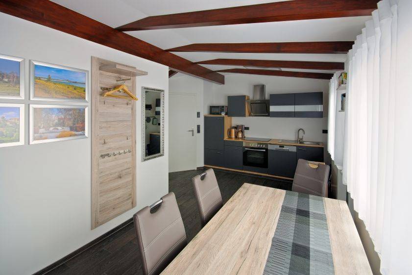 Küchenzeile: vollwertiger Herd mit Backofen, Geschirrspüler, Mikrowelle, Kühlschrank mit Gefrierfach,