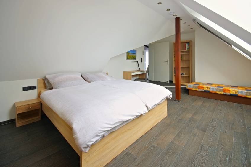 Schlafzimmer 1: Verdunklung durch Außenjalousie, Gazefenster, Bett 180 x 200 cm, Polsterliege,